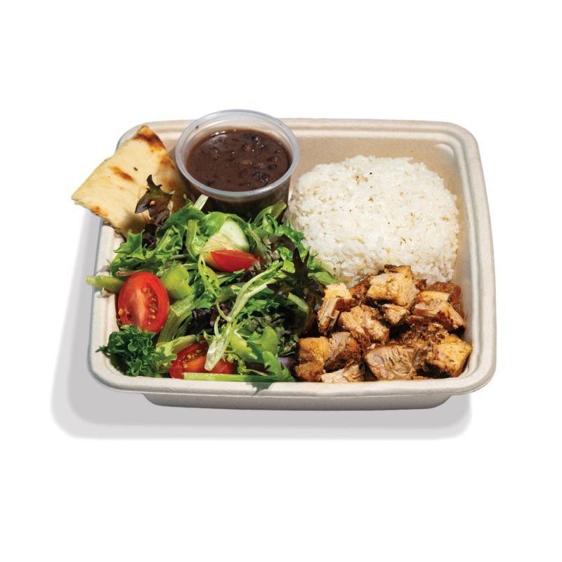 100% fresh chicken (pollo asado) served with a half cup of white or brown rice and a half cup of black beans. Choice of apple juice or small order of fries.