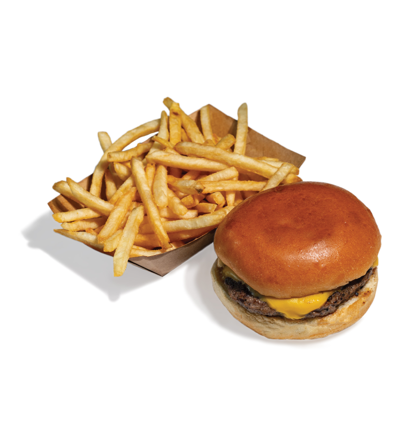 100% fresh American cheese, between a toasted brioche bun. Your choice of an apple juice or a small order of fries.