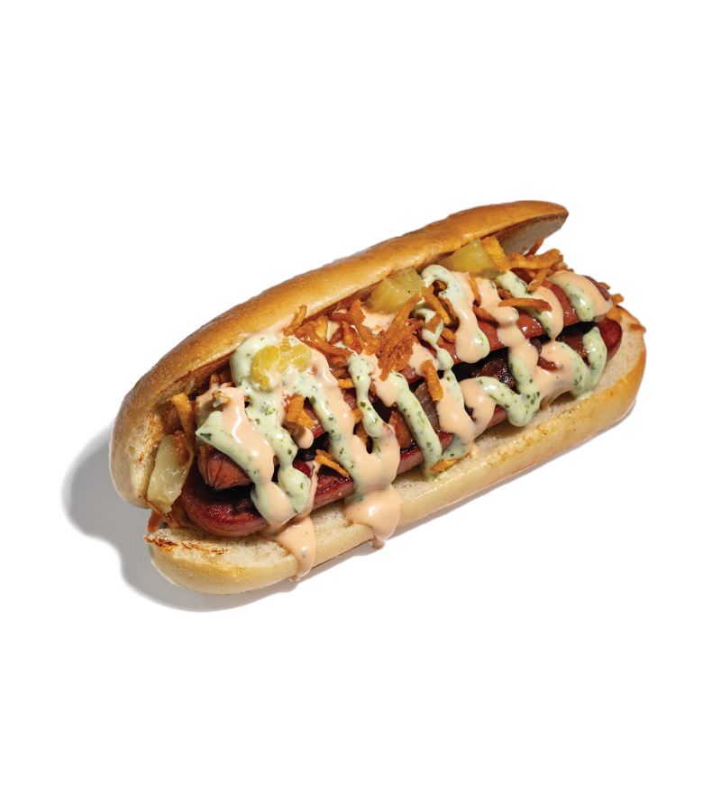 Our signature hot dog topped with applewood smoked bacon, chopped pineapple, PINCHO sauce, cilantro sauce and papitas on a toasted bun.
